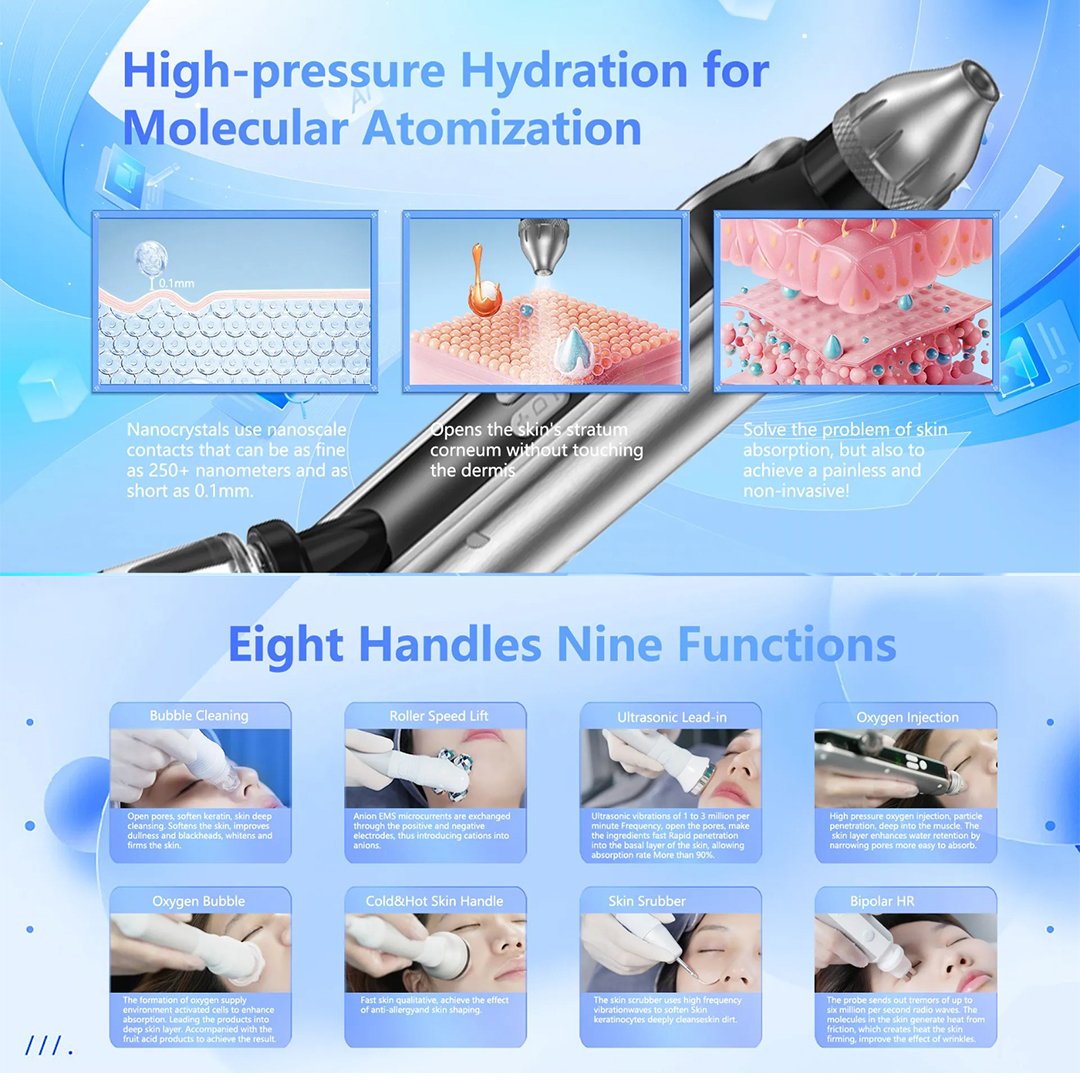 - Oxygen Injection: Delivers high-pressure oxygen to improve hydration and skin elasticity while tightening pores.